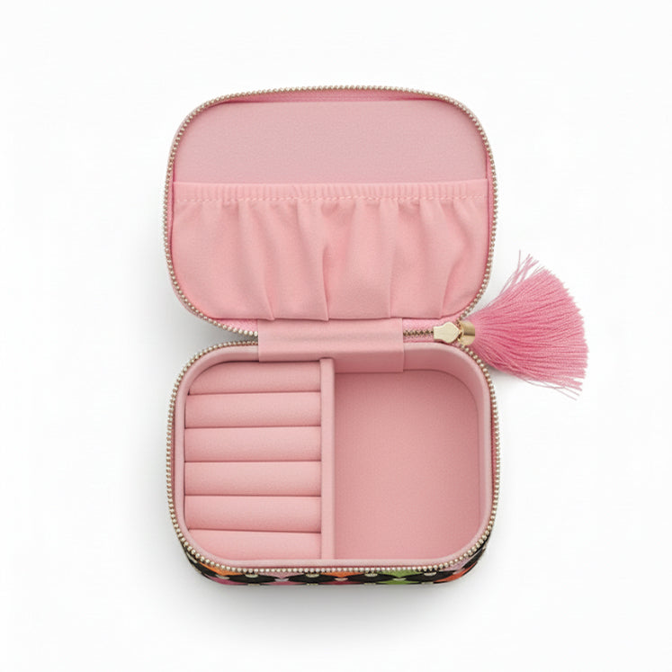 Add a touch of luxury to your everyday with our fabric-covered jewellery box, featuring delicate gold embroidered detailing and a soft pink tassel zip pull. Designed to keep your treasures organised and secure, this elegant piece is perfect for home storage or travel. A beautiful blend of function and style, it's a must-have for jewellery lovers.